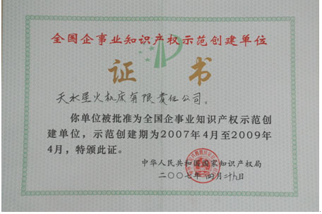 2009年12月,公司獲“全國企事業(yè)知識(shí)產(chǎn)權(quán)示范單位”證書