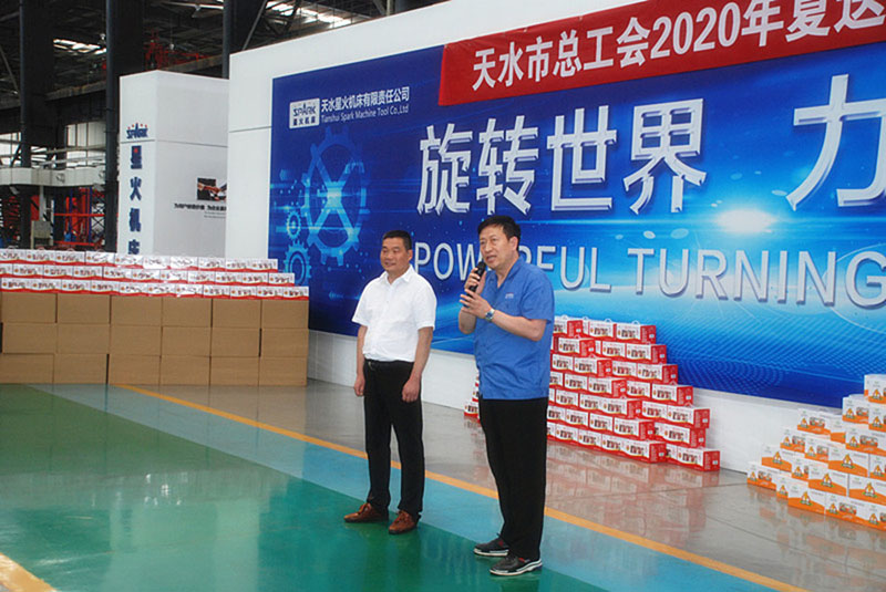 在星火機床公司工業園慰問活動現場,何付忠講話指出,我受市委市政府、市總工會委托,今天來星火機床公司開展2020年夏送清涼慰問活動。這是市總工會多年堅持開展的一項活動,充分體現了市委市政府、市總工會對企業職工的關心和關愛,以及貫徹落實“人民至上、生命至上、健康至上、安全至上”的理念。今年是極不尋常的一年,疫情、災情嚴重影響了經濟發展,作為企業,要提高政治站位,引導職工牢固樹立“四個意識”,增強“四個自信”,努力完成“六穩”“六保”任務。同時,要教育職工增強防范意識,做好疫情防控和防暑降溫工作,保障職工生命安全和身心健康,為公司圓滿完成生產任務做出應有貢獻。