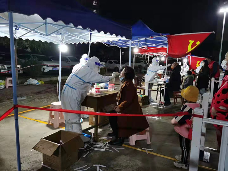 附件公司黨員職工組成抗疫突擊隊,為“黃碼”人員進行核酸檢測清掃環境、搭帳篷、擺桌子,保障照明,維持秩序。