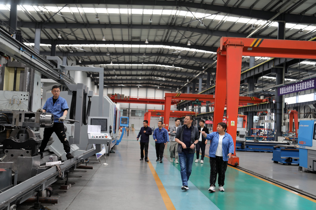 藺峰一行深入生產車間裝配現場,參觀生產場景和公司特色創新產品,在參觀調研中,展海瑜重點介紹了公司技術創新和發展經營等情況,對公司自主研發生產的高端數控纏繞機床、高精度大型數控軋輥磨床、大型五軸聯動機床、船舶用超大直徑筒體加工專用機床等各類產品的特點、用途、應用領域及市場前景做了詳細講解。并就目前產業政策、產業集群和產業協同發展等方面問題與藺峰一行作了深入交流。