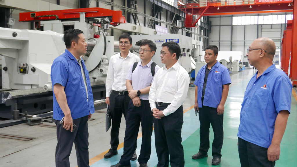 在星火公司生產現場,劉勝向陳新文一行詳細介紹了公司發展歷程、產品種類、加工能力、技術創新、未來發展規劃等,并陪同參觀了公司研發生產的各類大、重型機床,復合材料纏繞設備等。