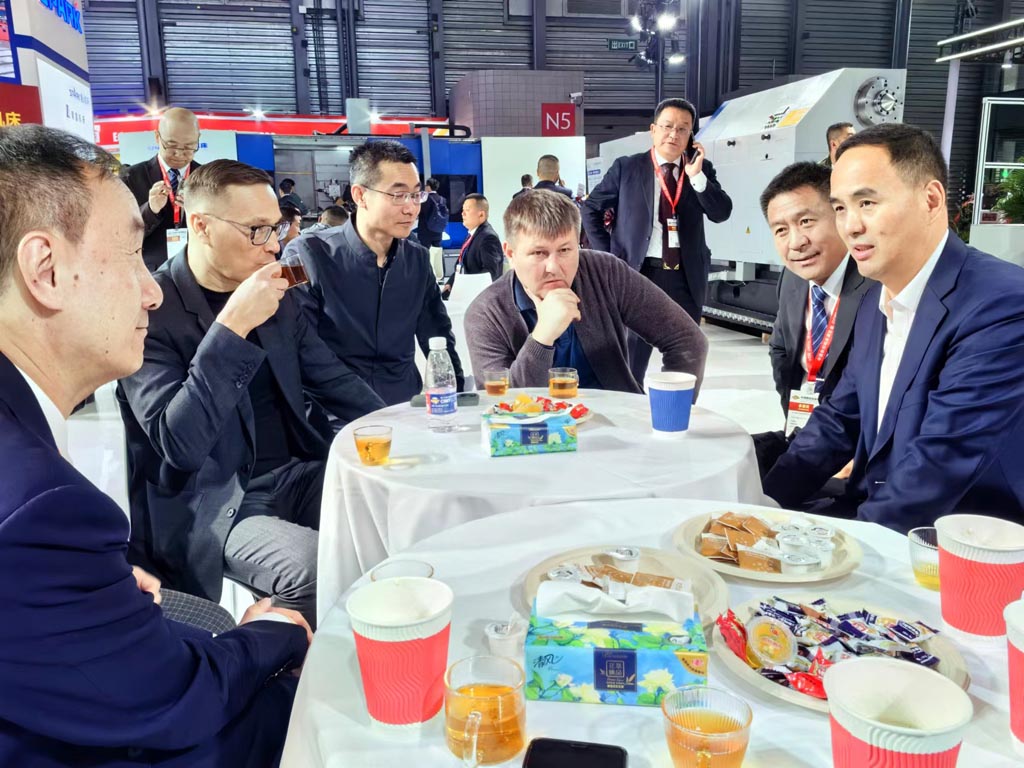 俄羅斯軌道交通集團客商一行在華中數控國際事業部王雪松的陪同下來到公司展位參觀洽談。