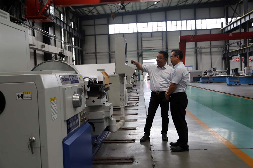 在工業(yè)園生產(chǎn)現(xiàn)場(chǎng),蔣保權(quán)向姜鑫一行介紹了企業(yè)的歷史沿革,并就企業(yè)發(fā)展現(xiàn)狀、技術(shù)儲(chǔ)備、人才培養(yǎng)等相關(guān)問題以及企業(yè)精細(xì)加工、產(chǎn)品國產(chǎn)化率等進(jìn)行了交流。蔣保權(quán)結(jié)合現(xiàn)場(chǎng)的各類機(jī)床產(chǎn)品及加工設(shè)備,詳細(xì)介紹了企業(yè)技術(shù)研發(fā)、市場(chǎng)拓展、科技成果轉(zhuǎn)化、產(chǎn)業(yè)鏈延伸等情況。