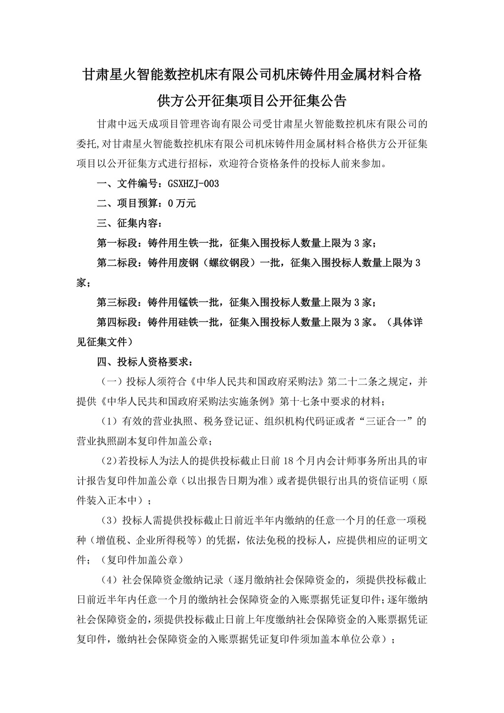 甘肅星火智能數控機床有限公司機床鑄件用金屬材料合格供方公開征集項目公開征集公告