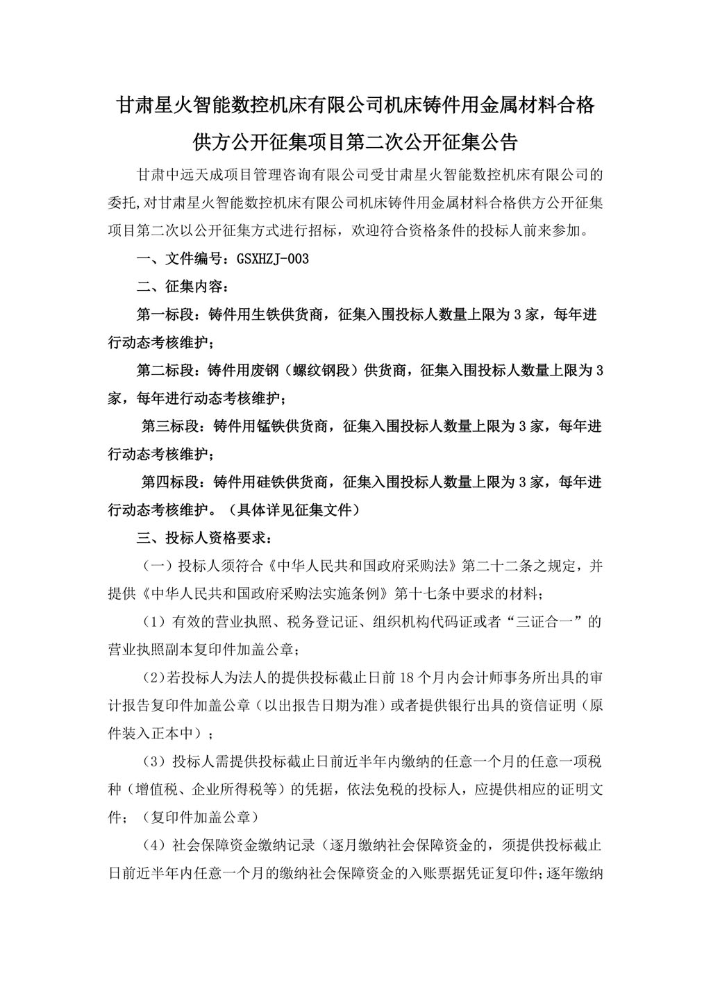 甘肅星火智能數控機床有限公司機床鑄件用金屬材料合格供方公開征集項目第二次公開征集公告