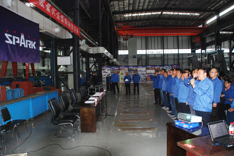 隨后,參會人員先后上臺,面向公司SPARK旗幟列隊,舉起右手宣誓。蔣保權為星火集團及星火機床公司領導領誓。宣誓人齊聲朗誦誓詞:星火品牌,代代傳承,質量根基,全員責任;始于設計,推陳出新;精于工藝,孕于匠心;成于裝配,雕琢精品;立足市場,客戶為尊;勵精圖治,上下同心,星火興亡,我的責任。劉勝、蔣俊分別為各管理部門參會人員領誓。